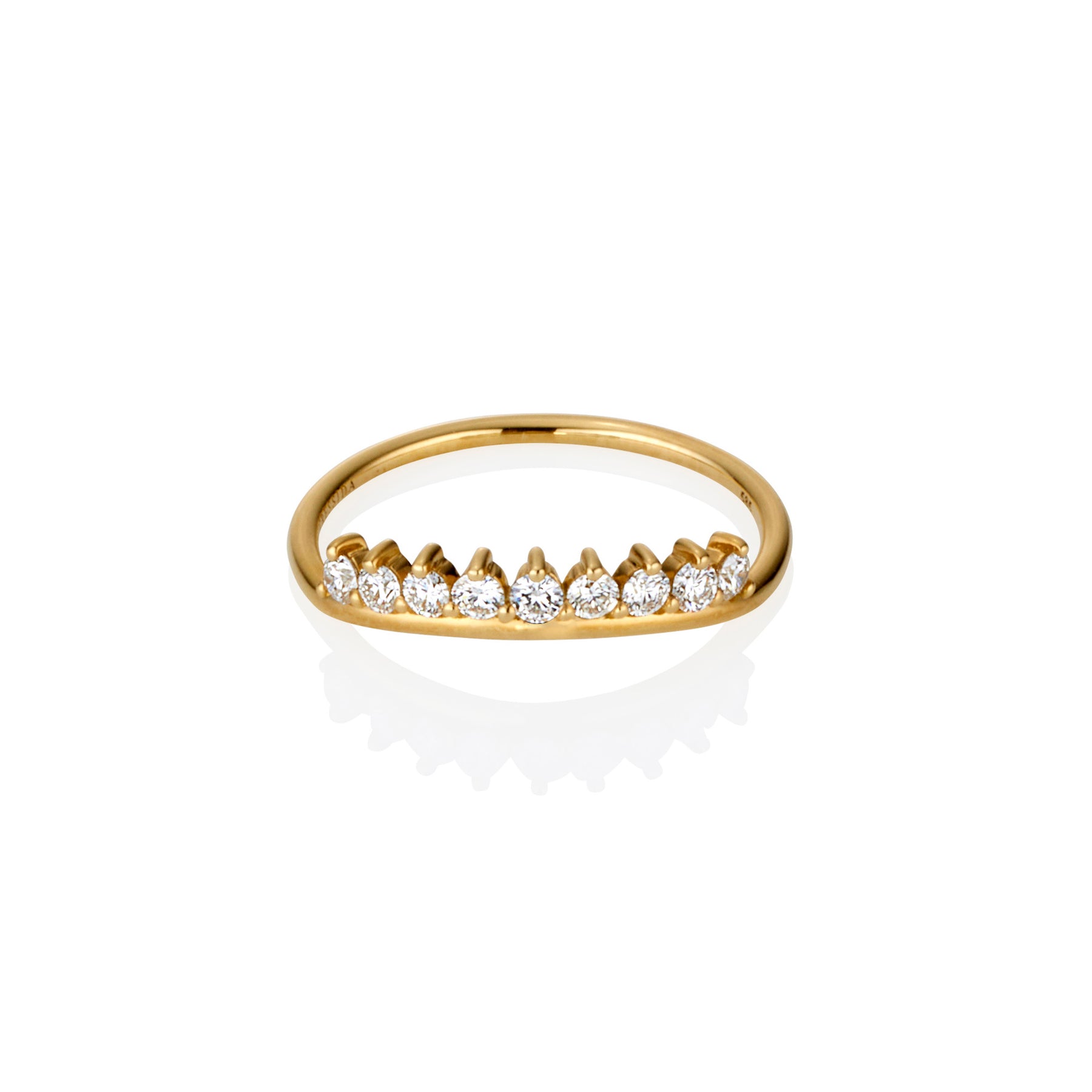 The regal Duchess ring features 9 x 2mm round, brilliant cut melee diamonds, set on a graceful 1.3mm band. With her diamond tiara detail set atop a gentle arch, she's the epitome of a fairytale. The Duchess is royalty in her own right when worn alone, and compliments an array of stacking pieces.